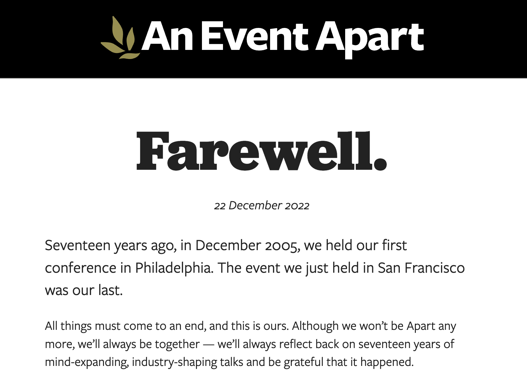 I friggin missed what turned about to be the very last An Event Apart (AEA). No tears though, just a salute to a legendary run.